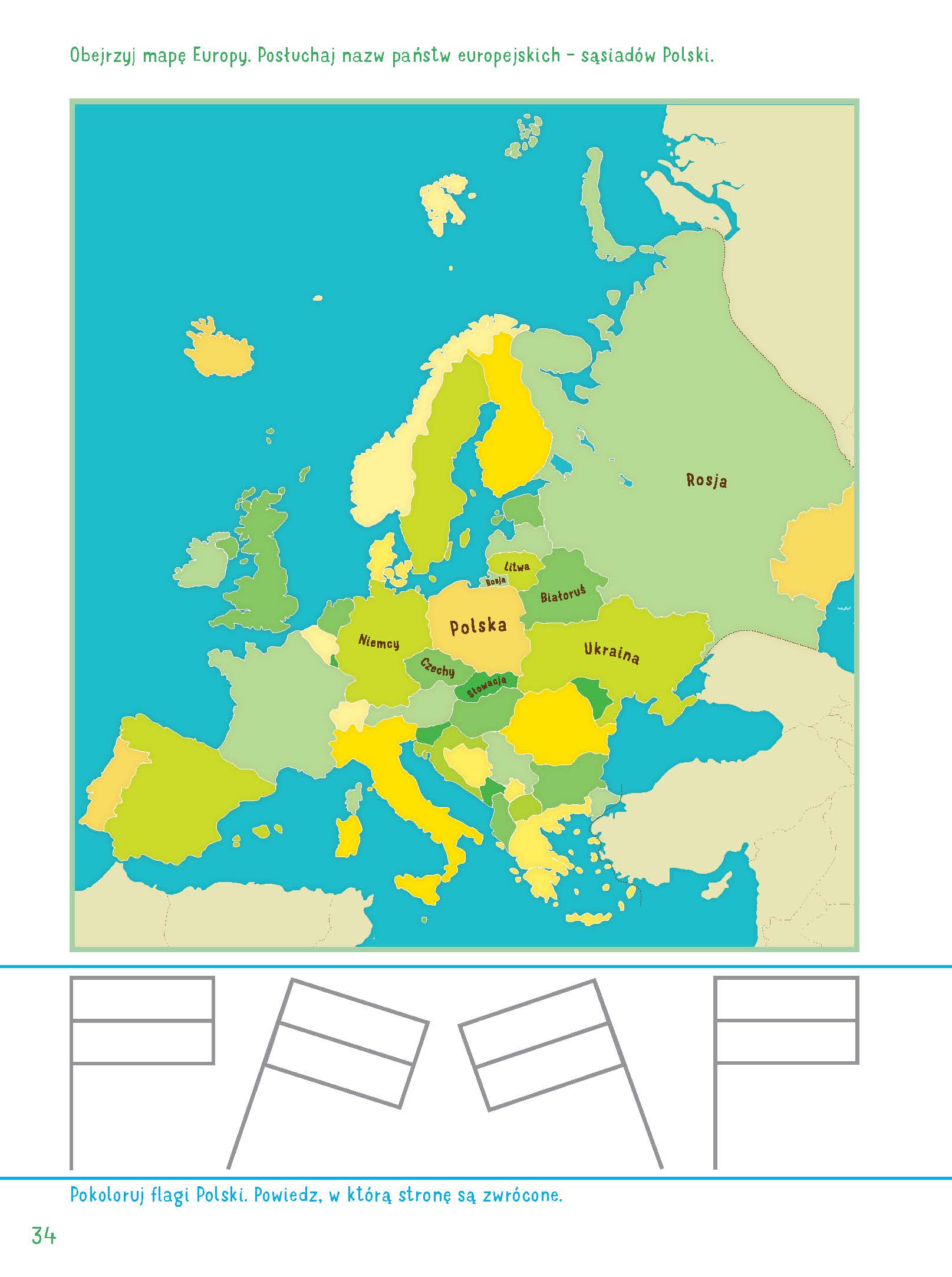 Rodzic pokazuje mapę Europy. Podaje nazwy sąsiadów Polski. Dziecko koloruje flagi. (Załącznik 1)