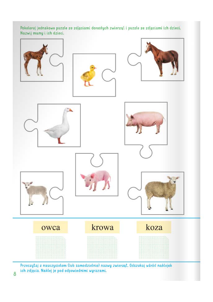 Kolorowanie tak samo puzzli ze zdjęciami dorosłych zwierząt i ich dzieci. Nazywanie mam i ich dzieci. Czytanie całościowe nazw zwierząt przedstawionych na zdjęciach (5-latki) lub samodzielne (6-latki). (Załącznik 2)