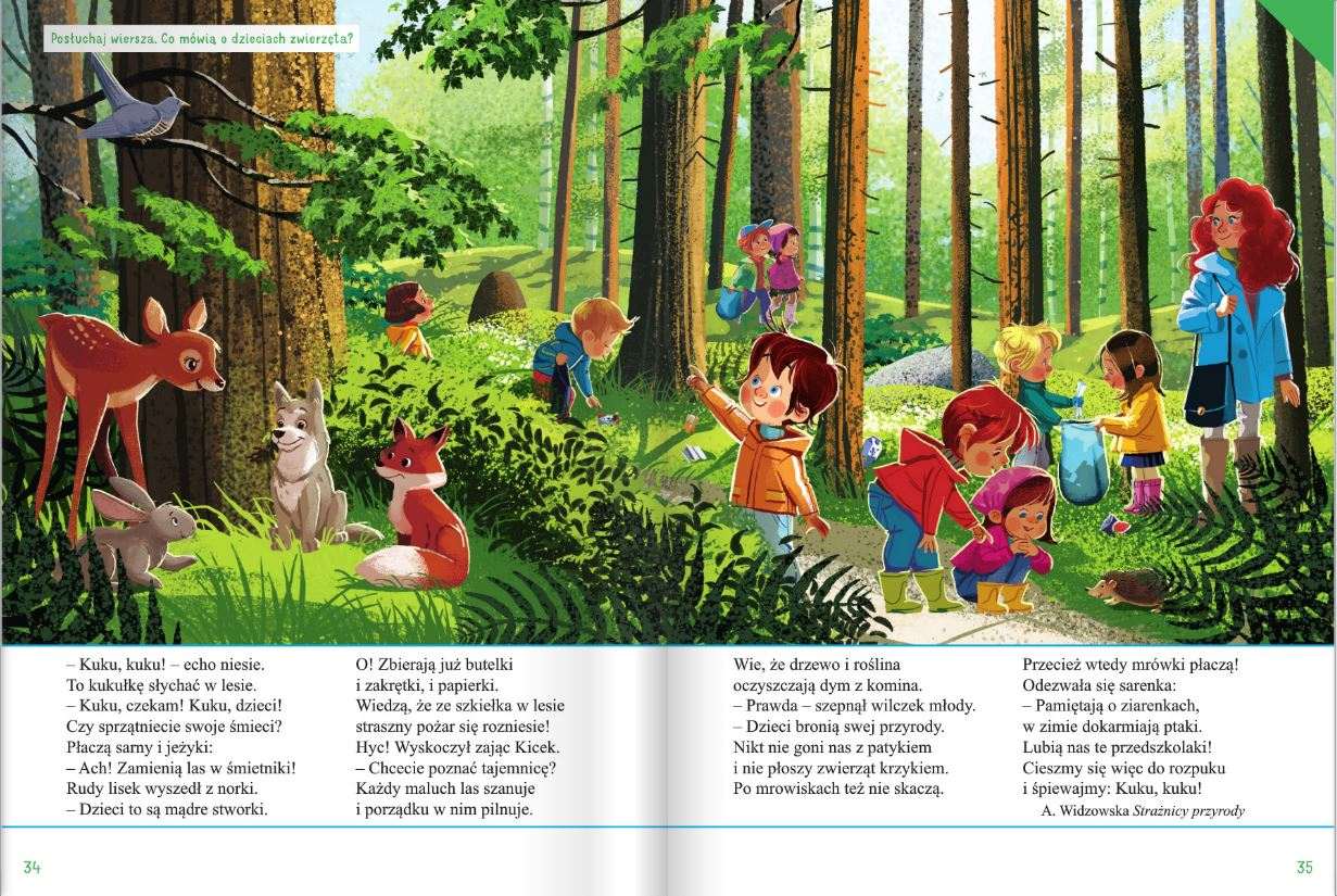 Rodzic wyjaśnia, że lasy to płuca Ziemi, bo produkują tlen, którym oddychamy, zatrzymują także pył i kurz, oczyszczają powietrze, a drzewa iglaste wydzielają olejki eteryczne.
