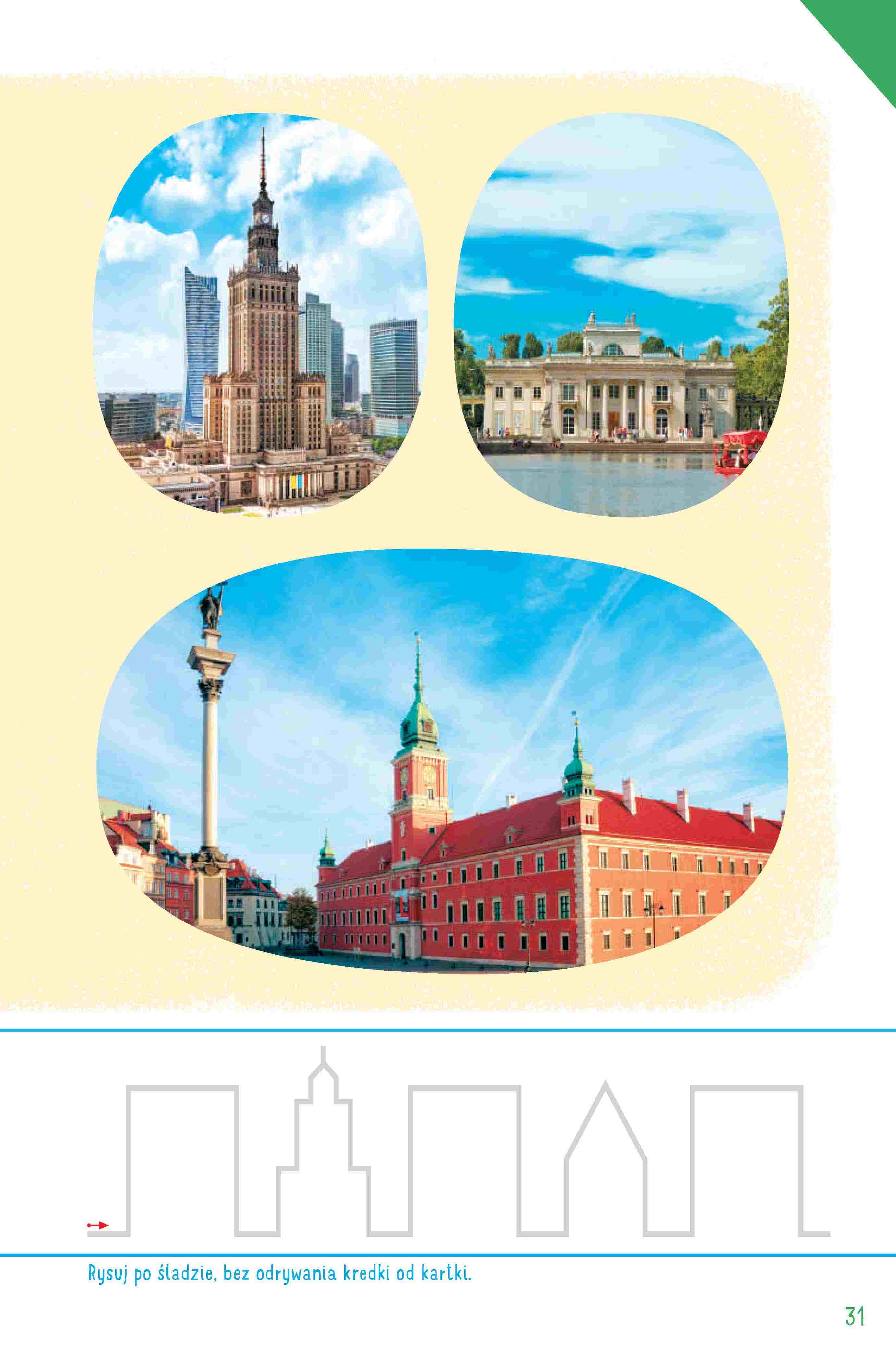 1. Określanie, co zwiedzali w Warszawie Olek, Ada, mama i tata z rodzicami mamy. Oglądanie zdjęć warszawskich syrenek. Rysowanie po śladach rysunków bez odrywania kredki od kartki. (Załącznik 1-1, 1-2)